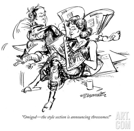 After the second drink, the room was spinning, she said. I got the bill, and she went to the bathroom. I needed to go as well, so I followed. It’s a coed bathroom, and there’s a picture of man and a woman on the door. “Guy and girl! Let’s make it a threesome!” she said in a joking way. I waited for her to go, and I went after. The whole time I was thinking that threesomes for her are probably as commonplace as spreadsheets for me.